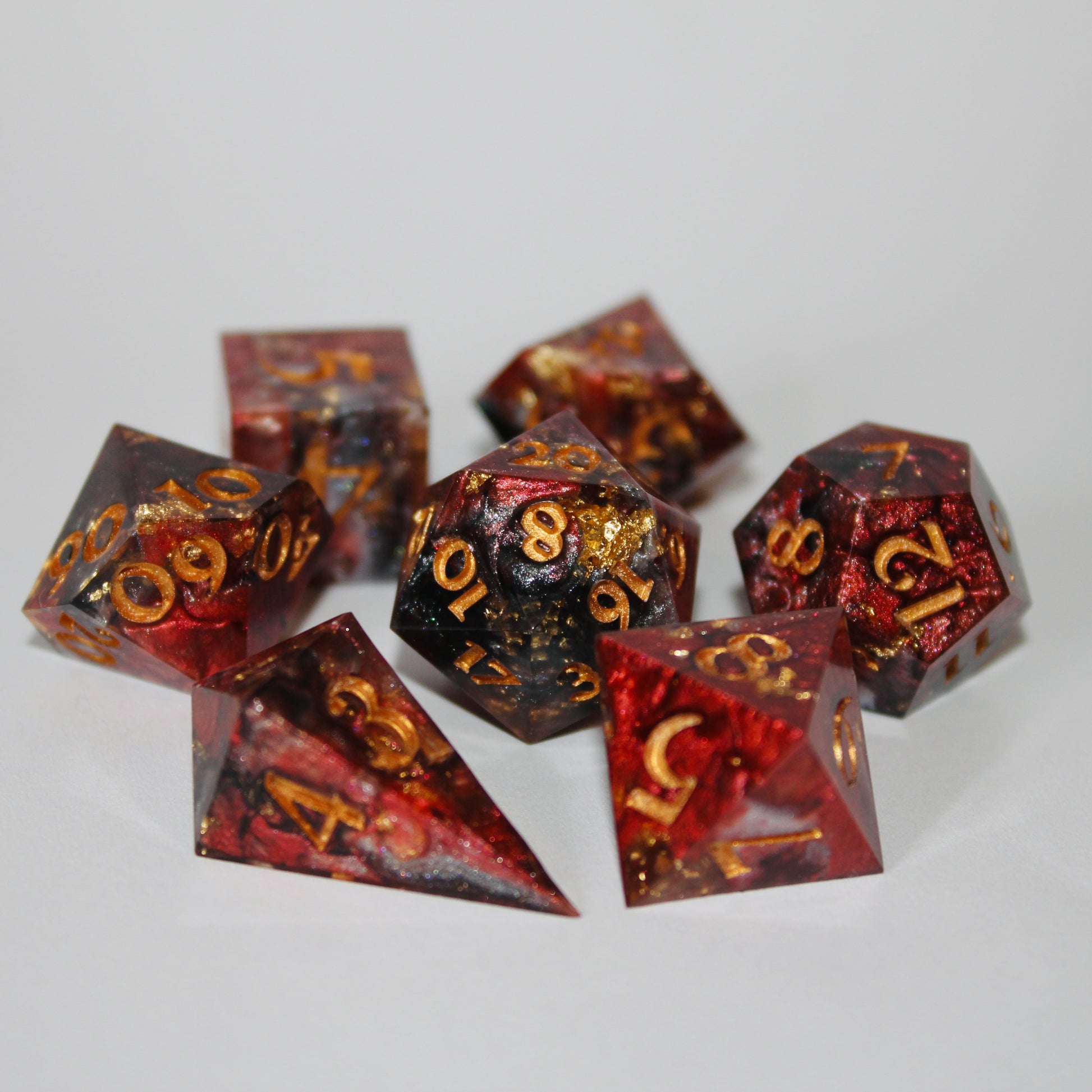 These sharp edge dice consist of metallic red, white and black resin swirled together with some clear and gold leaf for a soul suckingly cool design. These dice were originally designed for 'Shoot From The Hip' and their first D&D campaign.